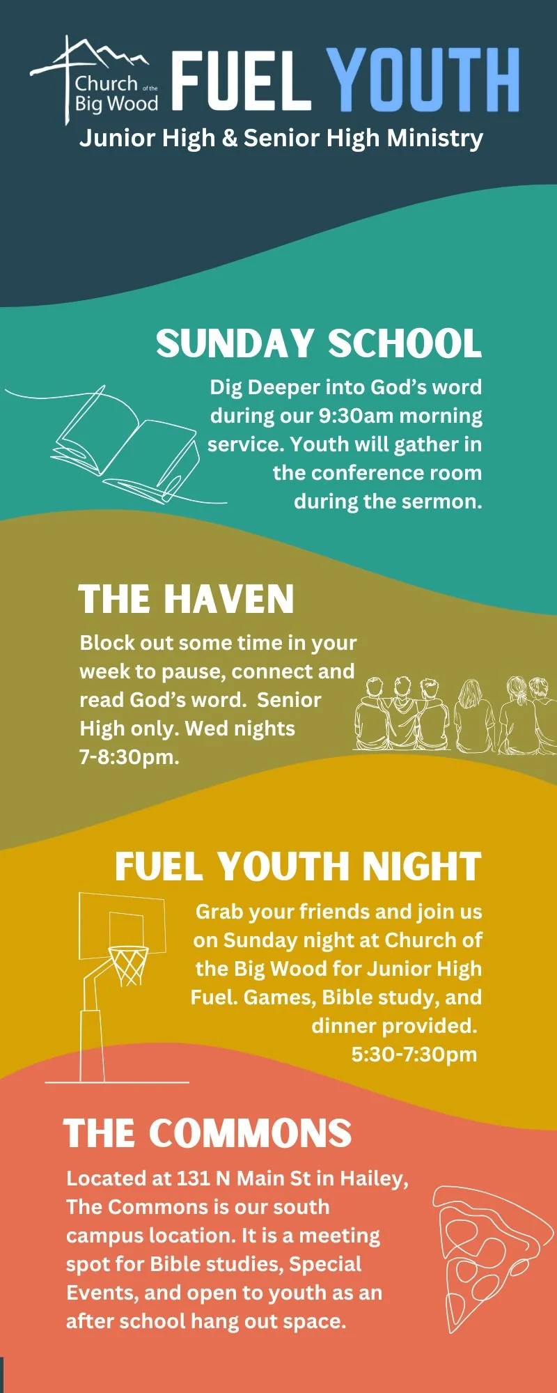 Connect with us! Text fuelyouth to (208) 379-0280 to stay in the loop on all that is happening at Fuel. Find us on Instagram or sign up for our monthly newsletters here. Fuel Youth Group takes place here at Church of the Big Wood.